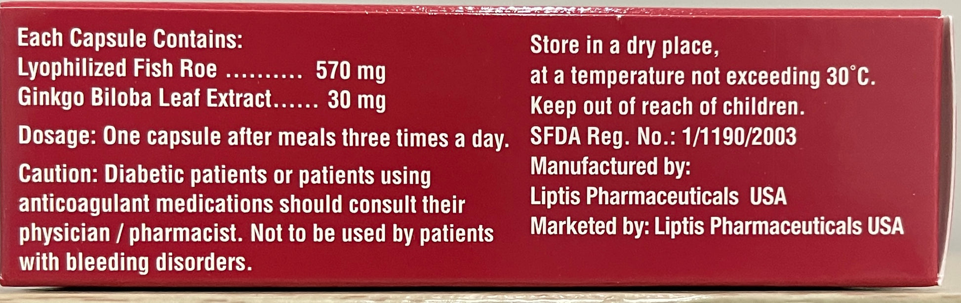 مكمل غذائي ومنشط جنسي يحتوي على بيض السمك المجفف ومستخلص الجنكة بيلوبا ، يستخدم لحالات انخفاض الرغبة الجنسية ومشاكل خصوبة الذكور. يستخدم الجنكة بيلوبا أيضا كمكمل غذائي يؤخذ عن طريق الفم لتعزيز الذاكرة عن طريق تحسين الدورة الدموية والعمل كمضاد للأكسدة ، مما يبطئ التغيرات في الدماغ.