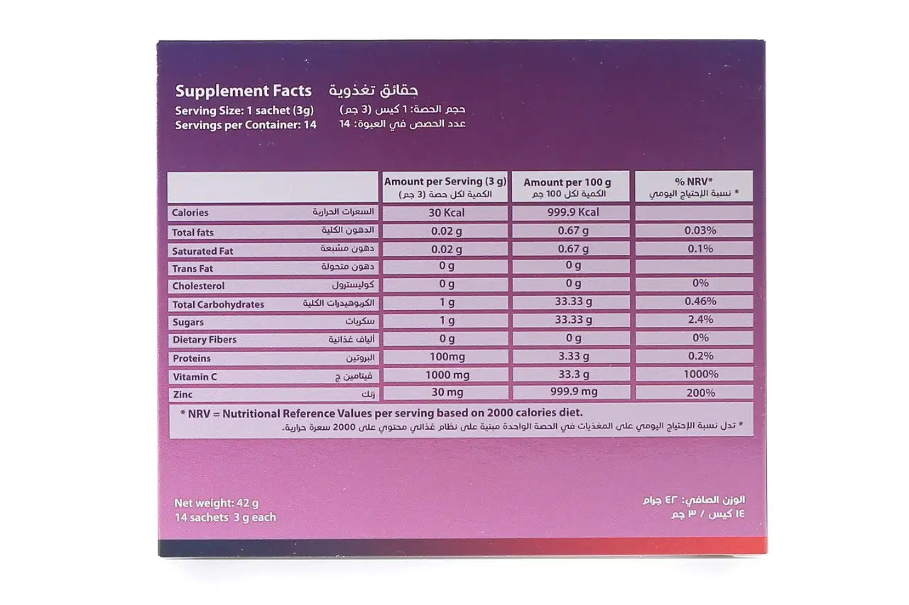 - فيتامين ج (ل حمض الاسكوربيك) ، غلوكونات الزنك (مصدر الزنك) ،